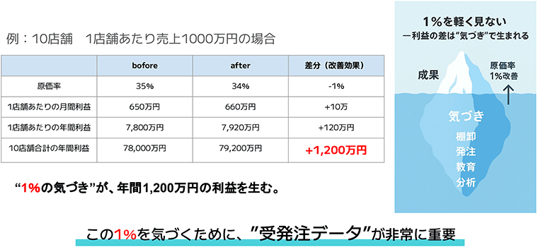 たかが1%と思うかもしれませんが、そのインパクトは甚大です。例えば、1店舗あたり月商1,000万円の店が10店舗あったとします。原価率のズレを1%改善できれば、1店舗あたり月10万円、全店で年間1,200万円もの利益が生まれます。