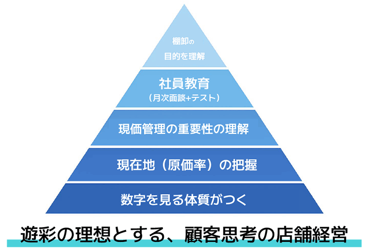 おっしゃる通り、システムを入れるだけでは意味がありません。“データを入力するのは人”だからです。かつては現場も、棚卸=面倒な作業という認識で、なぜやるのかを理解していませんでした。そこで私たちは、現場教育のための“5段階のピラミッド”のような順番で取り組みました。