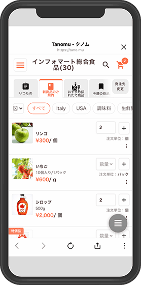 全社的に販売する商品は、本部が「カタログ」に登録しています。一方で、営業が個別に特定の商品を売りたい場合は「チラシ配信」を活用して、LINEを使って配信するといった棲み分けをしています。また、『TANOMU』に掲載した新商品に注文が入った際は、その日のうちに通常商品としてシステム登録を済ませるルールを徹底し、リピート注文に繋げています。