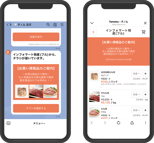 | カタログ機能 季節のオススメや期間限定商品、特定の企業向けの販促など、用途にあわせたカタログを作成できます。 | チラシ配信機能 オススメ商品や新商品をピックアップして、チラシとしてお取引先様のLINEに直接配信できます。 |