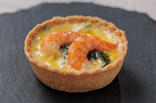 バターソテーしたほうれん草の風味と海老のプリプリ感を楽しめるミニサイズのキッシュをオードブルとして提供します。