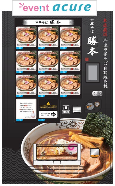 ● この企画は、期間とテーマを決めて販売する新コンセプト自販機コーナー「イベントアキュア」の取り組みの一環で、「お店の営業時間外や、お店に行く時間がない方でも、『中華そば勝本』のラーメンを楽しめること」をテーマに、この度登場します。ぜひ、この機会に足をお運びください。