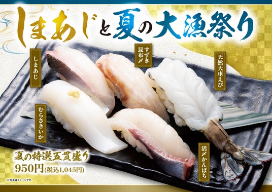 1.夏の特選五貫盛り 1,045円夏のオススメのネタを一皿でご堪能いただける五貫盛りです。