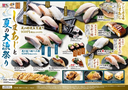 コロワイドグループの株式会社アトム(本社:神奈川県横浜市 代表取締役社長:田中公博)は、回転寿司業態の「にぎりの徳兵衛」「海鮮アトム」「海へ」の各店で、2024年7月9日(火)から、「しまあじと夏の大漁祭り」を期間限定で実施します。
