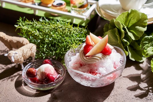 また弓削牧場のフレッシュチーズを使ったアイスクリームデザート「チェリージュビレ 弓削牧場フロマージュフレのアイス」や、イギリスの人気スイーツ「ピーチ メルバ」からインスピレーションを得た、ピーチ、ラズベリーとミルクアイスの優美な組み合わせが楽しめるシェイブアイスも登場。