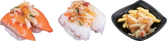かっぱ寿司は、「地球環境」や「健康と美味しさの両立」を考えた商品開発、提供に取り組んでいます。今回、天然資源に依存しない、人工(じんこう)種苗(しゅびょう)100%の完全養殖である「黒瀬ぶり」と、キャベツの芯を美味しくアップサイクルした「国産キャベツマリネ」が初登場いたします。また、環境負荷が低くサステナブルで安定的な生産が可能な閉鎖循環式陸上養殖で生産されている「とっとり琴浦グランサーモン」や、コロワイドの自社製品である「大豆ミート」を使用した商品を販売します。