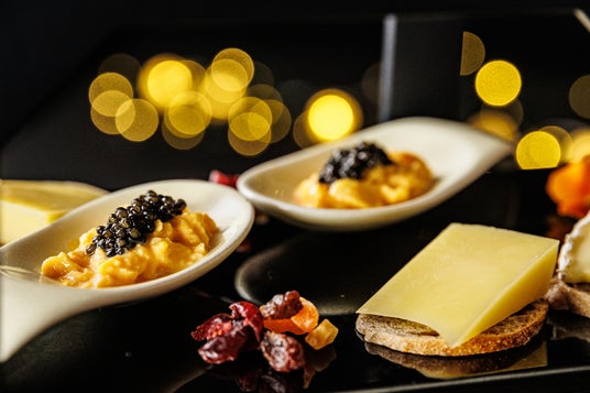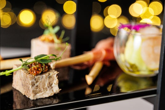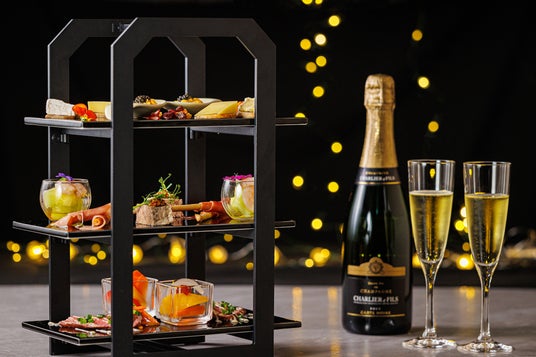 お食事は、フランス産チーズや生ハムの他、隣接するフレンチレストラン「La Belle Assiette(ラ ベル アシェット)」で提供しているテリーヌなど、全9種類のセイボリーをご用意。フリーフローのお飲み物は、シャルリエ・エ・フィスのシャンパン、ワイン、カクテルなどをお選びいただけます。