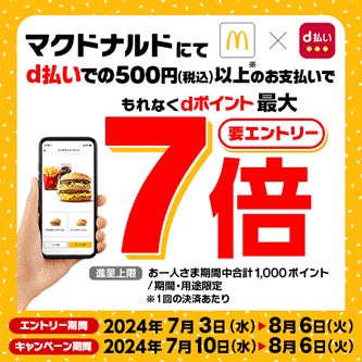 本キャンペーンへの参加にはエントリーが必要です。エントリー期間中にエントリーの上、キャンペーン期間中、マクドナルドでd払い(モバイルオーダー、マックデリバリーサービスでのネット決済、店頭(ドライブスルー含む)でのコード決済)にて1回のお会計につき500円(税込)以上お支払いすると、もれなくdポイントを最大7倍(通常ポイント1倍+キャンペーンポイント6倍)を進呈いたします。