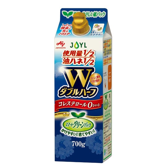 JOYL「AJINOMOTO ダブルハーフ」は、揚げものにも炒めものにも使えて、使用量も油ハネも1/2※1になる食用油です。1/2の量で揚げもの、炒めものが調理できます※2。揚げものの衣ともなじみやすい油のため、通常の油に比べて衣の中の水分が早く抜け、1/2の油でもカラッとおいしく揚がります。1回の使用量が1/2になるため、家計の負担軽減にもつながります。また、水分ともなじみやすい油のため、油の中に分散する水滴が小さくなり、調理中の油ハネも1/2に抑えられます※2。炒めもの、揚げものなどの油を使った調理後の掃除が簡単で、後片付けも楽になります。