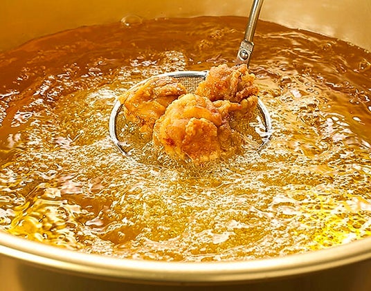 2. 鍋に3cm深さのJOYL「AJINOMOTO ダブルハーフ」を入れ、約180℃に熱する。