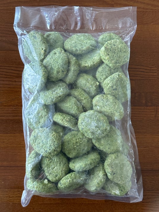-原材料名:鶏肉(国産)、玉葱、春菊、小松菜、ほうれん草、パン粉、卵白、豚脂、粒状大豆たん白、みじん生姜 等