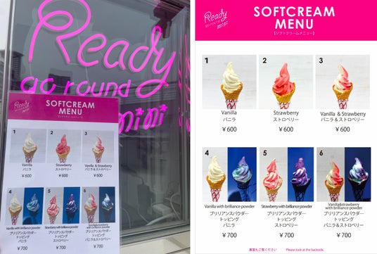 神戸ポートタワー低層1階「Ready go round mini[レディーゴーラウンドミニ]」で販売している「ソフトクリーム」です。フレーバーは〈バニラ〉〈ストロベリー〉〈バニラ&ストロベリー〉の3種類で各600円、ブリリアンスパウダートッピングは各700円です。※ブリリアンスパウダートッピングタイプは夕刻以降にテイクアウトカウンター横に出現するブラックライトが点いた「ブリリアンスボックス」に入れると光ります。