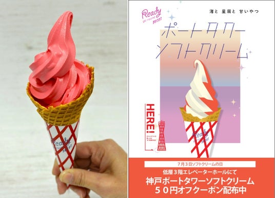 フェリシモは、「ソフトクリームの日」2024年7月3日(水)の「神戸ポートタワー」入場チケットを購入した人に、光る赤いソフトクリームもある『神戸ポートタワー「ソフトクリーム」』の割引クーポンがもらえるキャンペーンを実施します。有料エリアの展望フロアからお帰りの際に、低層3階エレベーター降り口で割引クーポンをプレゼントします。神戸ポートタワー低層1階(無料エリア)外側北西面に面したテイクアウト専門のスナックバー「Ready go round mini[レディーゴー ラウンド ミニ]」(営業時間/10:00~20:00)で利用できます。クーポン券を提示すると「神戸ポートタワー ソフトクリーム」各種の定価より50円割引で購入することができます。※クーポン券の使用は7月3日(水)当日限り有効です。