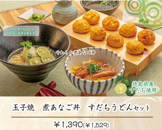 「 名物玉子焼(明石焼)」と、やわらか煮あなごを特製甘たれで絡めた「煮あなご丼」、この時期にピッタリのすだちとひまわり特製お出汁の冷やし出汁で仕上げた「冷やしすだちうどん」がセットになった玉子焼メニューです。あなごのふわふわ食感とすだち、お出汁の香りをお楽しみ下さい。