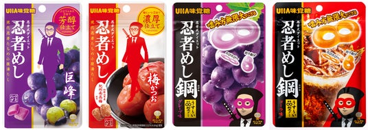 「忍者めし 巨峰」は、噛みしめるほど、ぶどう感が広がる味わいです。「忍者めし 梅かつお」は、梅本来の甘酸っぱさに、かつお由来のダシの旨みのアクセントが、クセになります。「忍者めし鋼」シリーズは、無限大!?食感の「∞」型のグミで、従来の忍者めしよりハードさがアップ!引き伸ばしたり、折りたたんだり、お口の中で無限に楽しめます。