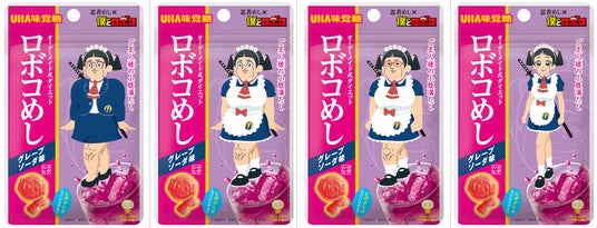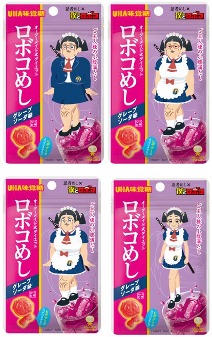 UHA味覚糖「忍者めし」と人気アニメ「僕とロボコ」のコラボ商品です。可愛らしいロボコの顔の形をした忍者めしで、作中で登場するロボコたちの愛用ドリンクをイメージしたグレープソーダ味に仕上げました。ロボコのチャームポイントである、メイドらしからぬムキムキな膝が、レアグミで入っているかも!?