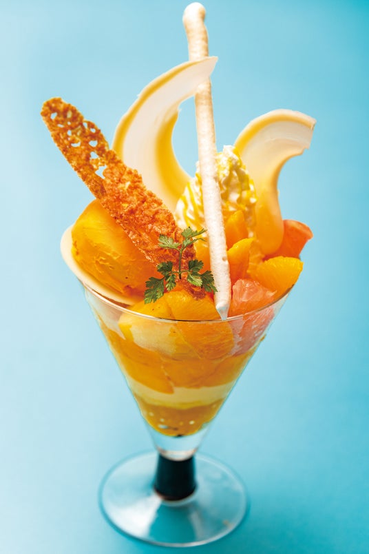 たっぷりのアップルマンゴーの果肉に、ゼリーやソース、自家製のシャーベットとコンフィチュールなど、マンゴーのいろいろな魅力を一度に味わえる、上から下までマンゴーづくしのパフェです。トップにオレンジとパイナップル、ピンクグレープフルーツ、アップルマンゴーをのせてトロピカルな果実感たっぷりに仕上げました。一面の窓から差し込む夏の陽射しを感じながら、南国リゾートのように優雅な夏の午後をお楽しみいただけます。