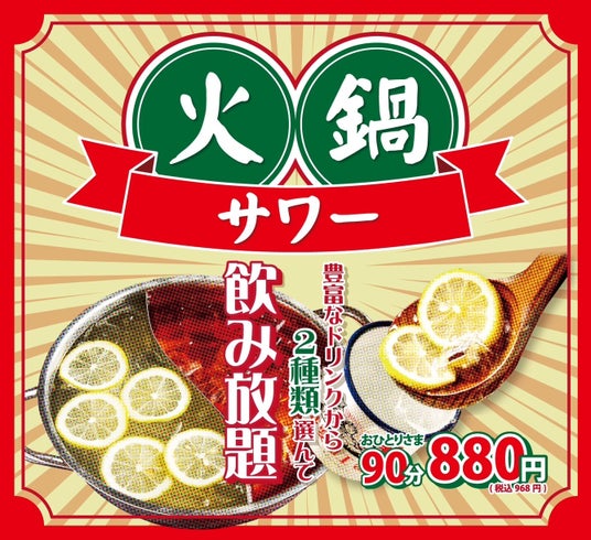 ・火鍋サワー ¥880 (税込¥968)今SNSで話題の「火鍋サワー」!24種類のフレーバーの中から2種類を選び、お玉ですくってシェアしながら楽しめる新感覚サワーです。お一人様90分飲み放題 ¥880(税込¥968)でお楽しみ頂けます。