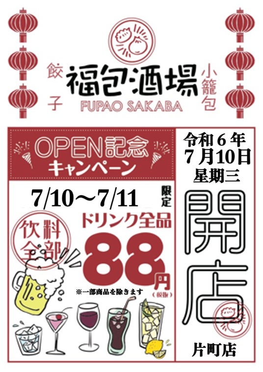 7/10(水)~7/11(木)限定!!ドリンク全品88円(税抜)でご提供致します。是非この機会にご来店下さい。