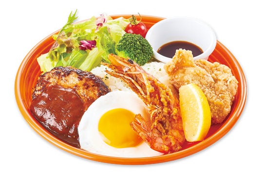 <S>ハワイアンコンボプレートハンバーグ、目玉焼き、ガーリックシュリンプ、モチコチキンとサラダが彩られた、ロコモコのようなプレートです。
