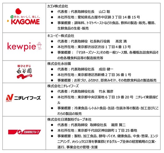左より:カゴメ株式会社(取締役執行役員 生産調達本部長 葉色 義久)、キユーピー株式会社(取締役 常務執行役員 渡邊 龍太)、TECHMAGIC株式会社(代表取締役社長 白木 裕士)、株式会社永谷園(取締役 生産本部長 相澤 直史)、株式会社ニチレイフーズ(常務執行役員 生産統括部付部長 兼 生産統括部国内生産管理部長 山本友紀)、株式会社日清製粉グループ本社(取締役常務執行役員 技術本部長 高橋 誠一郎)