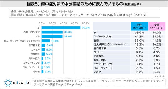 水分補給は「水」に次いで、男性は「スポーツドリンク」女性は「お茶」を飲んでいる