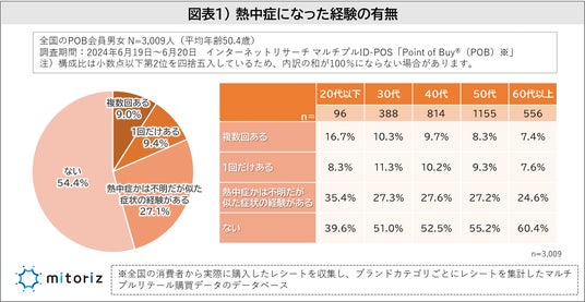 最初に「過去に熱中症になった経験の有無」を調査したところ「経験あり」と回答した人は「複数回ある(9.0%)」と「1回だけある(9.4%)」を合わせて18.4%という結果となりました。「熱中症かは不明だが似た症状の経験がある(27.1)」まで含めると45.5%となります。年代別ではサンプルがやや少ないものの、20代以下が合わせて60.6%となり最も高い数値となりました(図表1)。