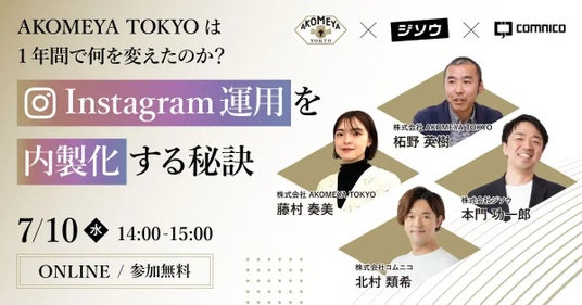 株式会社ラバブルマーケティンググループ(本社:東京都港区、代表取締役社長:林 雅之、証券コード:9254)の子会社で、企業のSNSマーケティング支援事業を行う株式会社コムニコ(本社:東京都港区、代表取締役:長谷川 直紀、以下 コムニコ)は、2024年7月10日(水)14時から、株式会社AKOMEYA TOKYO様をゲストにむかえ、無料オンラインセミナー「AKOMEYA TOKYOは1年間で何を変えたのか?Instagram運用を内製化する秘訣」を開催いたします。