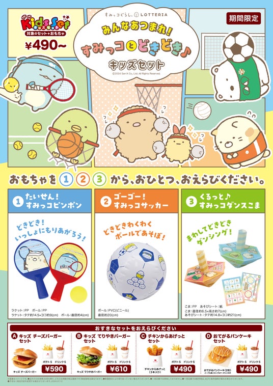 内 容:「キッズセットメニュー」(A.キッズ チーズバーガーセット、B.キッズ てりやきバーガーセット、C.チキンからあげっとセット、D.おてがるパンケーキセット)1種類+「すみっコぐらしおもちゃ」(1. たいせん!すみっコピンポン、 2. ゴーゴー!すみっコサッカー、3. くるっと♪すみっコダンスこま)1種類