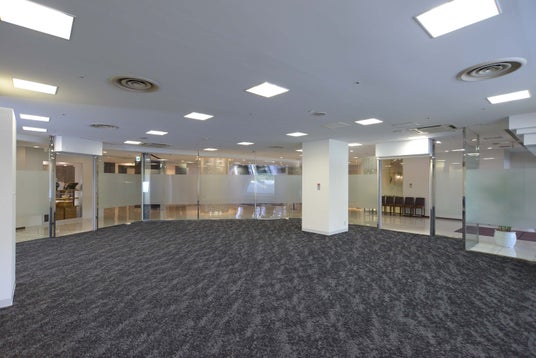 会場全景。壁面ガラス張りの開放的な空間。大通りに面したエントランスからのアクセスが良好。