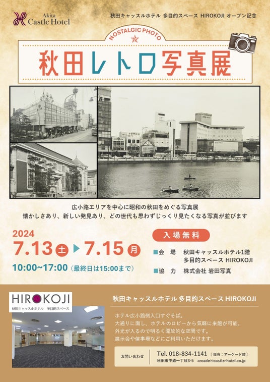 オープンを記念し、7月13日(土)から15日(月・祝)までの3日間限定で「秋田レトロ写真展」を開催。広小路を中心に昭和の秋田をテーマにした懐かしい写真を展示いたします。入場無料です。