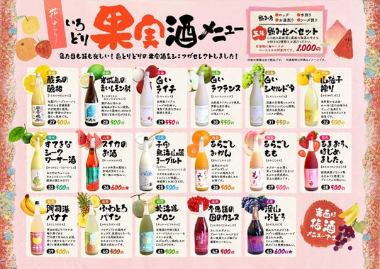 ▲カラフルな果実酒で乾杯! 見た目も華やかな「いろどり果実酒メニュー」。全国から集めた珍しい果実酒が勢揃いし、女性に大人気。フルーティな味わいと鮮やかな色合いで、飲むだけでなく写真映えも抜群。友人や家族とシェアして楽しんで。
