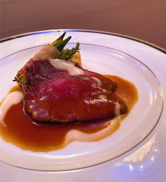 ピンチョスや生ハムメロンなどを盛り込んだオードブルに、メイン料理では香味野菜と共に低温調理で時間をかけてじっくりと火を通したローストビーフを提供いたします。