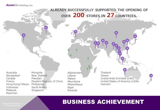アセンティアは、2010年より海外フランチャイズ支援を開始し、これまでに27ヵ国に200店舗を超える店舗を出店してまいりました。