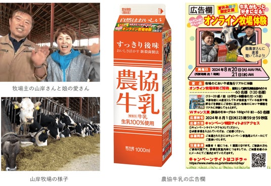 第7弾となる本キャンペーンでは、7月7日(日)~8月1日(木)の間、農協牛乳の側面広告や協同乳業公式Xを通じて参加者を募集し、抽選で60組の方を、8月20日(火)、21日(水)に開催する「オンライン牧場体験」に招待します。