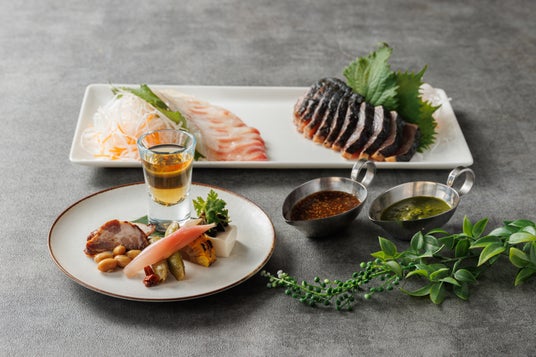 180グラムの国産豚を8時間かけて柔らかく低温調理し、高温で焼き上げ、酢豚に入る定番野菜はあえて使用せず、レモングラス、ハーブ、ドライトマトが合わさった爽やかなフルーツ果肉入り黒酢ソースで仕上げた一皿です。ナイフとフォークで贅沢に味わうステーキ仕立ての酢豚です。ぜひ赤ワインと一緒にご堪能ください。