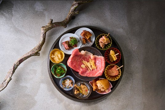 「金乃縁」を代表するメニュー。旬の食材を使用し、毎月変わるシェフこだわりの10種の小鉢と、生のまま食べられるほど新鮮な炙り和牛肉。シェフが目の前であぶった新鮮な和牛は、その柔らかさから「飲むように」お召し上がれます。