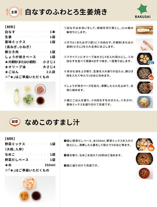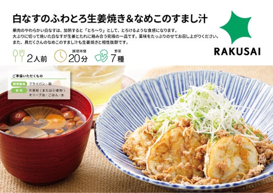 楽彩株式会社(本社:東京都足立区/代表取締役社長:大崎善保)は、7月8日より“白なすのふわとろ生姜焼き&なめこのすまし汁”を販売いたします。生姜焼きとたれに絡み合う「とろ~り」とした食感の白なすが究極の一品です。なめこのすまし汁と一緒に、食欲をそそる和のごはんセットを暑い夏にお楽しみください。