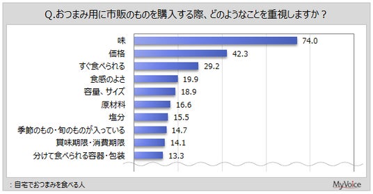 自宅でおつまみを食べる人の、おつまみ購入時の重視点は(複数回答)、「味」が74.0%、「価格」が42.3%、「すぐ食べられる」が29.2%です。