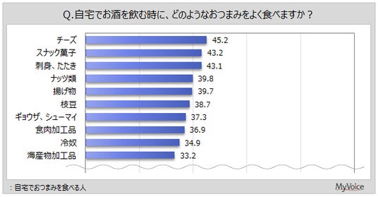 自宅でおつまみを食べる人に、よく食べるおつまみを聞いたところ(複数回答)、「チーズ」「スナック菓子」「刺身、たたき」が各40%台、「ナッツ類」「揚げ物」「枝豆」「ギョウザ、シューマイ」「食肉加工品」などが各30%台です。