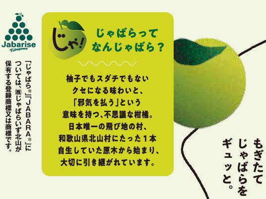 その昔、過疎化が著しく、特産品も無かった北山村で「じゃばらは北山村を過疎から守る産業になり得る」と声をあげたように、この小さな村の未来を創造していくにはじゃばらの発展が必要と考え、じゃばらの更なる認知拡大を目指し今回パッケージデザインをリニューアルいたしました。