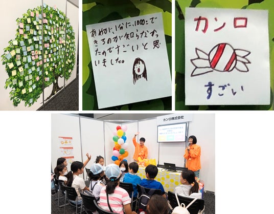 昨年、参加した児童が付箋で自由にメッセージを書いて貼った「学びの木」には、学びへの感想や、ロゴや商品のイラストなどが貼られ、カンロの届けたい思いが実ったのを表していました。