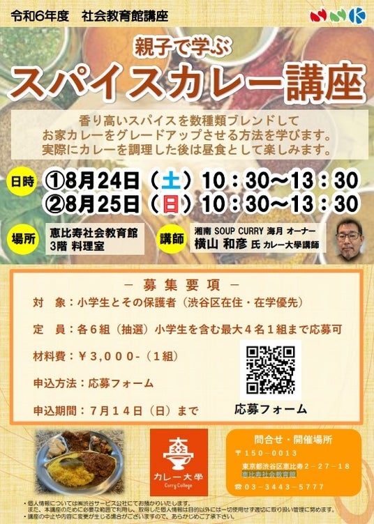 カレーミュージアム代表であった井上岳久が率いるカレー専門研究機関である株式会社カレー総合研究所(所長:井上岳久/東京都渋谷区)は、傘下のカレー大學が渋谷区の施設である恵比寿社会教育館主宰「親子で学ぶスパイス欧風カレー講座」とタイアップし8月24日に加え25日も開催します。講師として、湘南の名店「湘南SOUP CURRY海月」オーナーでカレー大學の主任講師である横山和彦氏が担当します。テーマは、今年トレンドの「クラフト欧風カレー」「新スパイス欧風カレー」で、作り方を教えるとともに一流の味を試食できます。