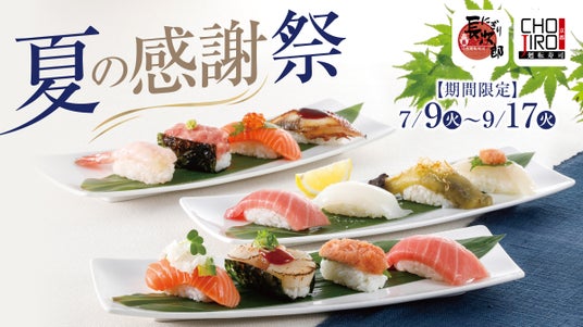 株式会社フーズネット(本社・大阪府大阪市、代表取締役社長・加藤誠)が運営する「活?廻転寿司にぎり長次郎」 「廻転寿司CHOJIRO京都」は、7月9日(火)から「夏メニュー -第1弾-」と「夏の感謝祭」を同時開催いたします。