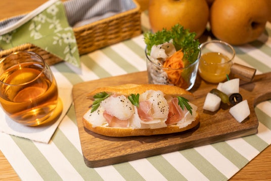 農園に到着したら、まずは梨狩りを体験。採れたてならではの鮮度抜群の梨を味わえます。みずみずしい梨をそのまま味わうことはもちろん、「梨モーニング」でも梨を堪能!出発時に地元で愛されるパン屋さん「クーロンヌ」で受け取ったパンに、生ハムと収穫したての梨を挟んでサンドイッチを作れば、生ハムの塩気と梨の甘味の絶妙なハーモニーを楽しめます。付け合わせのサラダや紅茶と共に味わう、自分で作ったサンドイッチの美味しさは格別です。爽やかな秋の朝に、梨の木々に囲まれて、旬の梨を味わい尽くす特別なひとときです。