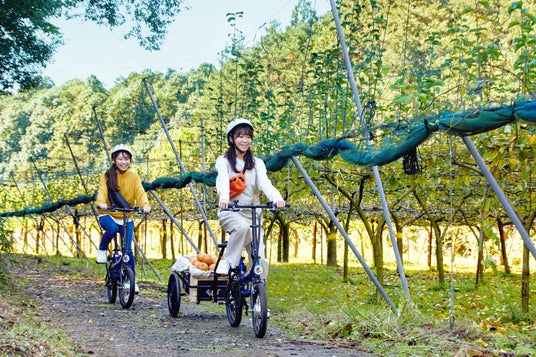 レンタサイクル、カーゴ付きE-bikeレンタル、レンタルヘルメット、梨狩り体験、梨モーニングセット、フレッシュ梨タルト作り体験