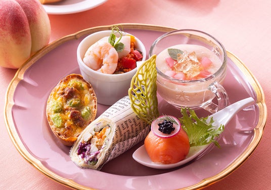 また、3段目には、ヨーグルトに桃とトマトのジュレを組み合わせた「冷製スープ」のほか、「シーフードと夏野菜のタブレ」や「スパイシーミートと枝豆のキッシュ」、「手毬スモークサーモン」など、充実の夏らしいセイボリーも、ご一緒にお楽しみいただけます。