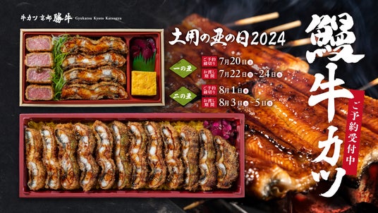株式会社ゴリップ(本社:京都府京都市)が展開する「牛カツ京都勝牛」は、2024年の土用の丑の日に向けて完全予約制のお持ち帰り限定商品として『贅の極み 鰻牛カツ重』と『丸ごと一本鰻カツ重』を発売いたします。今年の土用の丑の日は一の丑(7月22日~24日)と二の丑(8月3日~5日)も販売決定!また、対象店舗のLINE公式アカウントの友だちに限り、会計時に特別価格で販売いたします。