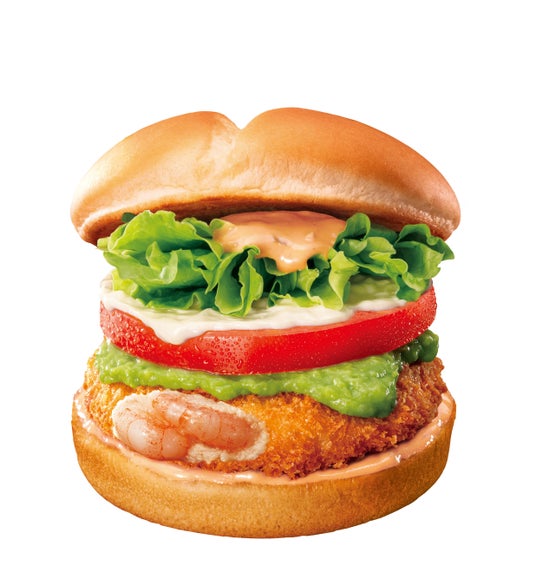 商品概要:プリプリサクサク食感のエビパティに、アボカドやニンニク、玉ねぎなどを混ぜ合わせて塩とレモンで味付けしたワカモレソースを合わせました。クリーミーで爽やかな酸味が特長の特製サウザンソース、とろ~りチーズソース、レタス、トマトとともに ふっくらなめらかな食感のバンズで挟んだ一品です。