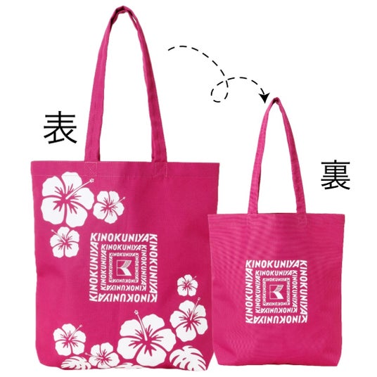 沖縄限定デザインのバッグは、ハイビスカス柄のホットピンク、パイナップル柄のグリーン、ハイビスカスが一面に描かれたピンクの3色展開。縦長サイズなので、背の高い商品も収まります。インナーポケットもついているので携帯電話や鍵などバッグの中でなくなりがちな小物も収納できます。
